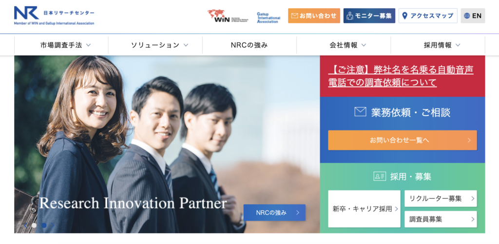 日本リサーチセンターは、オンライン調査に加えて、訪問調査、郵送調査、会場調査など複数の調査手法を組み合わせられる点が強みの調査会社です。Webだけではカバーしきれない対象者にもアプローチでき、調査設計の柔軟性が高いのが特徴です。