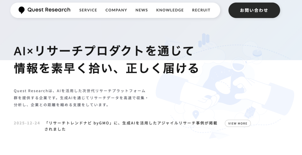 Quest Researchは、AIを活用した分析・示唆出し・レポート作成の自動化支援を特徴とする調査会社です。スピードとアウトプット品質のバランスを重視した設計がなされており、意思決定に直結する形での成果物提供を得意としています。