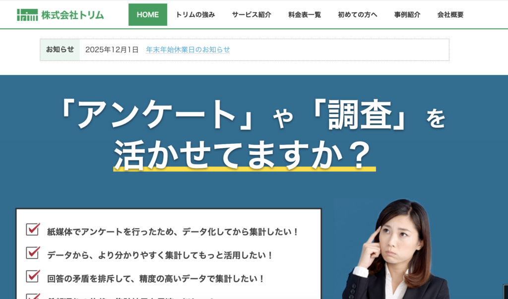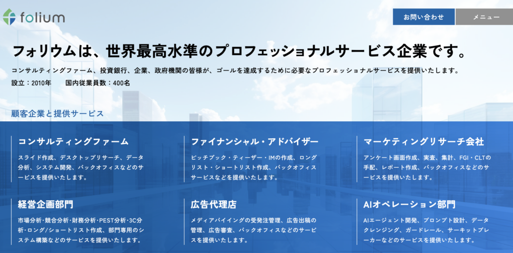 フォリウムは、マーケティングリサーチ業務のアウトソーシングに特化した会社で、設計から実査、集計、レポート作成までを一気通貫で支援します。繁閑差のある業務や大量処理にも強く、安定した運用体制が評価されています。